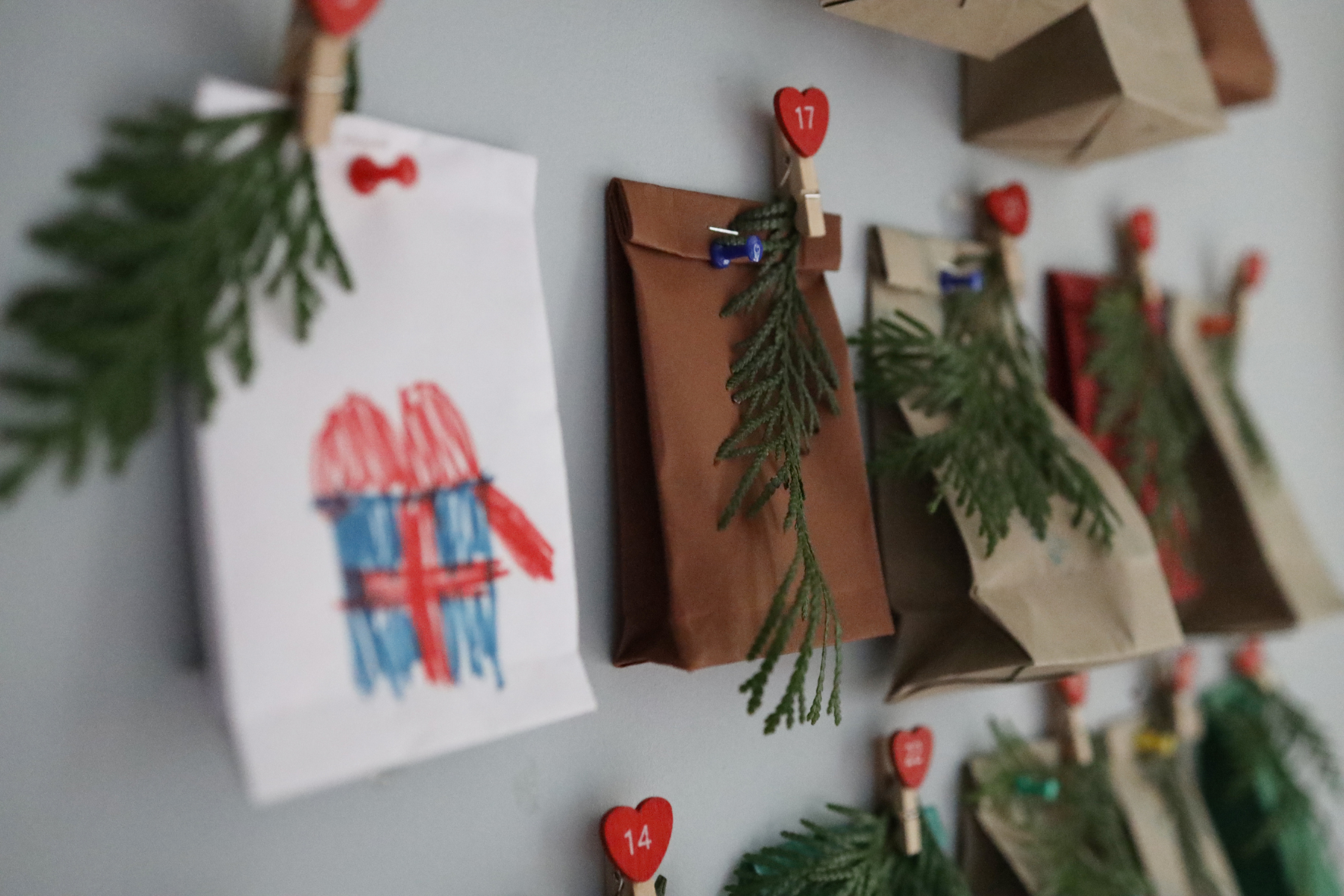 Coloca 24 mini-sobres colgados en una cuerda con ganchos de madera. Se ve súper aesthetic.
